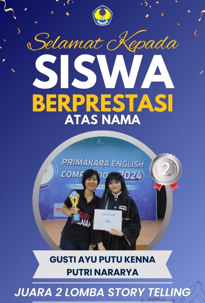 Bagaikan mentari menyinari bumi, keberhasilan Gusti Ayu Kenna Putri memberikan cahaya harapan bagi kita semua. Siswa SMA Negeri 6 Denpasar kelas XE 6 tersebut berhasil meraih juara II tingkat Kota Denpasar dan Kabupaten Gianyar dalam Lomba English Storytelling Contest 2024 yang diadakan oleh kampus Primakara.